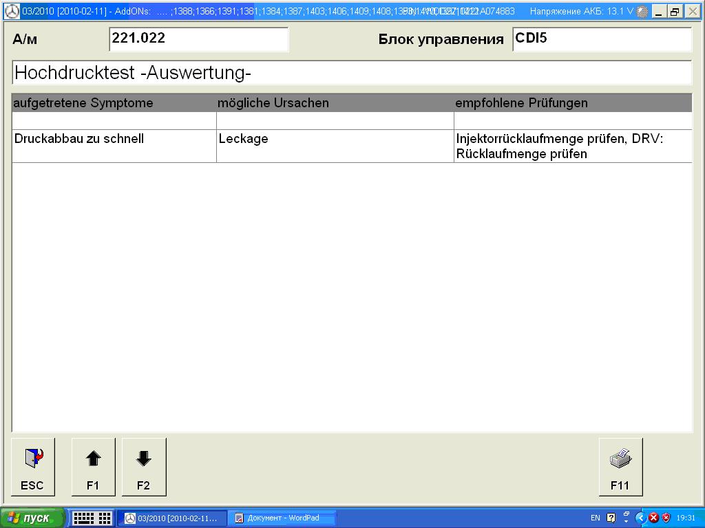 Авто: W221 320CDI 2006 г.в. Пробег: 186.000 Недавно пригнали моему боссу. Все было хорошо. Поездил в РБ около 2000 км. Потом поехал на Украину (1000) км еще на нашей хорошей солярке. Ехал с равномерной скоростью 130 км\ч. Под конец дороги двигатель начало колбасить. А именно, когда держишь 2000 оборотов (педаль в одном положении) обороты двигателя начинают плавать 1500-2000 оборотов со странным звуком (то ли воздух где-то неправильно нагнетается, то ли еще чего, но посторонний шум можно сравнить с механическим скрежетом чегото). Вообщем там (по месту) нормальной диагностики не было, пришлось ехать до Киева. В киеве на ОД проверили фильтры воздушные, они были с заводским дефектом (неплотно прилегали рифленые части фильтра к стенкам, т.е. были дырки сквозные). Они поменяли фильтры, скинули ошибки, но звук так и не устранился, на что они сказали, что это нормально, просрется-пропердится и станет нормально. Доехали в РБ, сняли фильтры и воздуховоды с расходомерами воздуха. Фото турбины прилагаю. Лопатки были жестко побиты. Думали, что в этом дело. Отдали турбу на восстановление. Поменяли вал, втулку и крыльчатки, т.е. остался родной только корпус, остальное все новое. Утвердили, что турбина отбалансирована. Сервис проверенный. Поставили. Результат тот же. Решили купить Star Diagnosis. Купили, подключили, выдало 2 ошибки: 1) на наддув воздуха (видимо изза турбины) 2) на регулятор ОГ. Выполнили, что просил Стар. Обнулили ошибки. Результат тот же. После этого подкинули с W211 с таким же мотором (заведомо исправной) расходомеры, регулятор ОГ. Результат тот же. При активации в старе клапана ОГ 1) в открытом состоянии показывает слабый поток воздуха и двигатель "ЗАДЫХАЕТСЯ" 2) в закрытом состоянии поток воздуха в норме. Думали, что забит сажевый фильтр, отсоединили полностью выхлопную трубу вместе с сажевым фильтром от турбины. Результат тот же (обороты плавают) и из турбины идет дым сизого цвета (но может так и должно быть). Включили в старе диагностику высокого давления (800, 1200, 1500, 1800 оборотов). Она что то диагностировала, меняла режимы, слышно было, как странный звук то появлялся, то пропадал, и в конце двигатель просто заглох и выдало таблицу (тоже прилагаю). На холостом ходу все параметры в норме по Star. Компрессия тоже в норме. Если дать педаль газа в пол, то она едет нормально, разгон хороший. Дергается только на оборотах 1500-2000. Прикрепляю видео последнего состояния работы клапана ОГ Y27/9 со снятой крышкой рабочего механизма:file.qip.ru/video/iiDCE3f1/VIDEO0002.html
