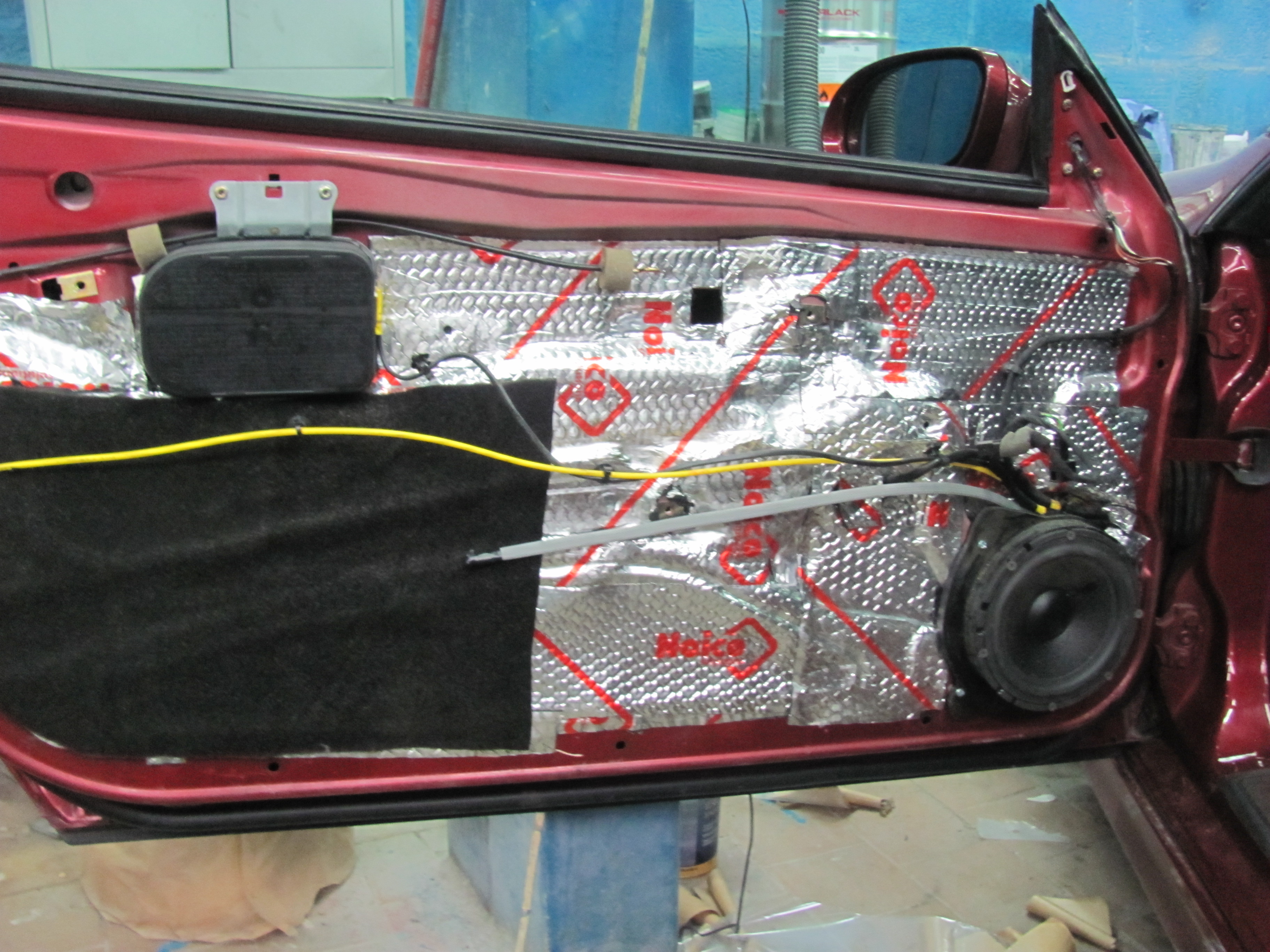 Уже имелись миды Kicx Pro, поэтому было необходимо добавить кроссоверы и твитера, сделать полную аудиоподготовку двери, установить мидбасы в доработанные штатные места. Дверь укатана вибродемпфирующими материалами Noico, шумоизоляция наружного и внутреннего слоев металла, технологические отверстия усиливались металлическими ребрами жесткости. Усилитель Focal Solid 2 разместился за спинкой пассажира, провода Stinger и Tchernovaudio.