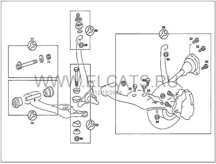 Левая сторона. Воспользоваввшись тем что подеска находиться благодаря пружине под напряжением отпускаем гайку нижней шаровой опоры 14 ключом на 21 (см. предыдущий рисунок) и гайку верхней шаровой опоры 68 ключом на 17.