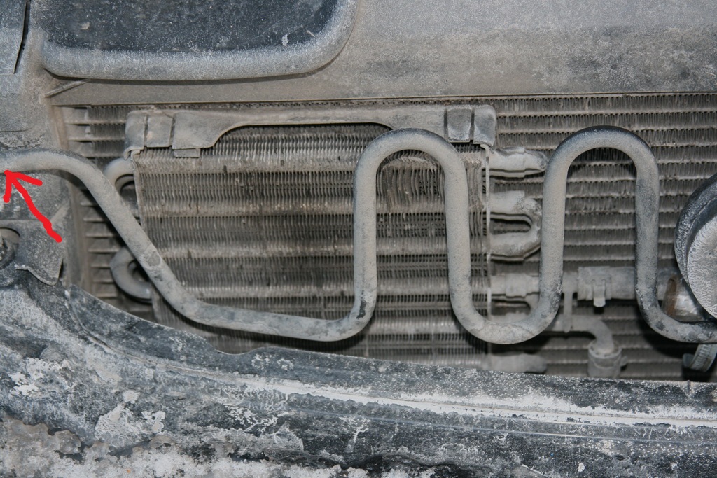 Она почему-то соприкосалась с пластиком в месте заправки кондея, видимо от вибрации и перетерлась (не перерубило, а от трения образовалась маленькая дырочка, как от иглы))). Сам я машину не бил еще))), следов аварии спереди тоже не вижу. ну х.з.