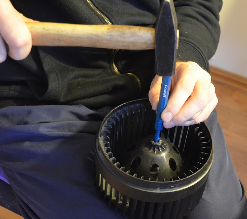 5. Сбиваем с оси мотора пластиковую крыльчатку. Она посажена плотно (кто-то пишет в интернете, что на "горячую"), но сбивается без проблем. Сначала, можно поставив на ноги (чтобы не повредить пластиковую крыльчатку) бить молотком прямо по оси моторчика. Перед этим советую замерить на сколько вал моторчика выступает из пластиковой крыльчатки (это понадобится при сборке). После того, как вал дойдет до крыльчатки, продолжаем выбивать с помощью стержня диаметром примерно 6мм.