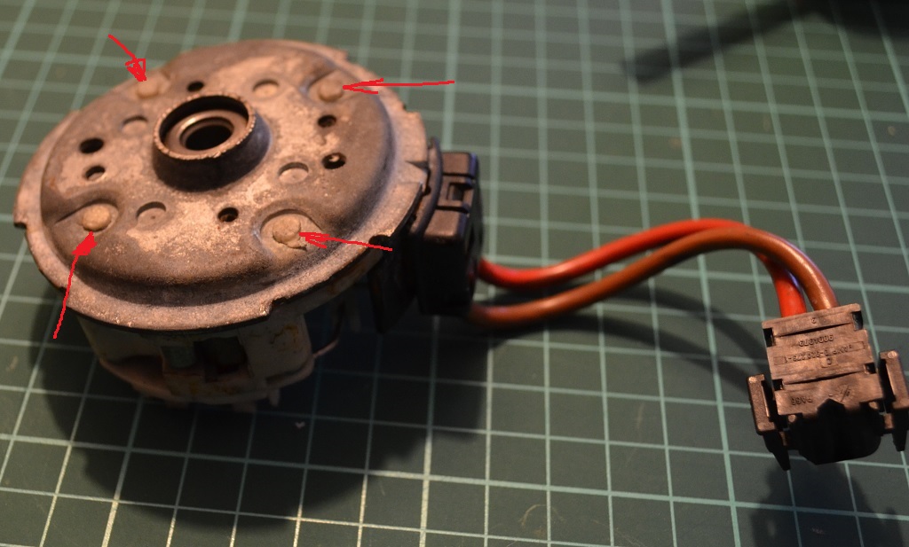Красными стрелками показаны крепления щеточного механизма к крышке моторчика