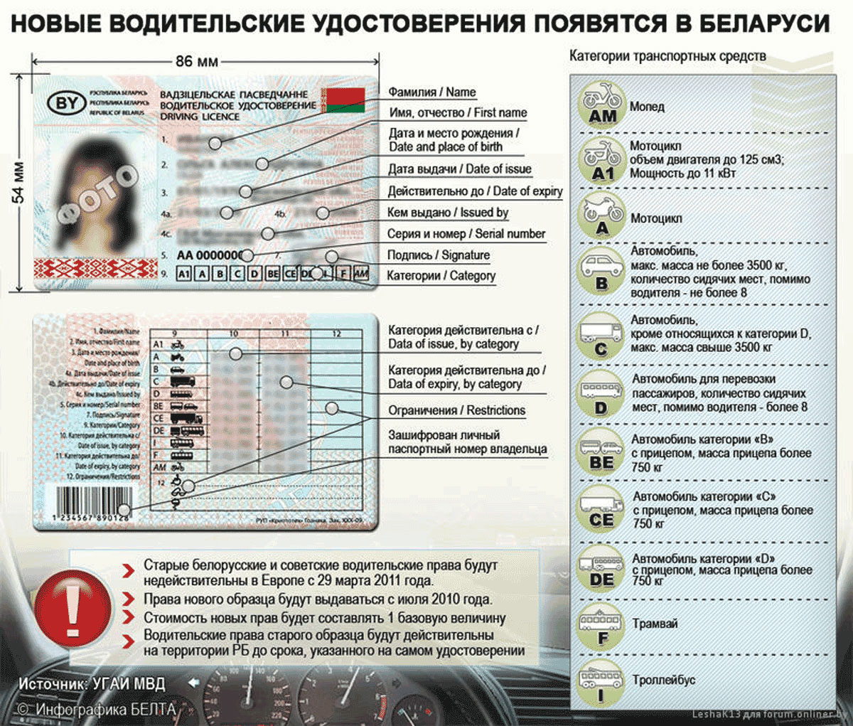Планируется, что новые водительские права водители начнут получать в декабре 2010 года. Это новшество связано с тем, что 29 марта 2011 года в Европе вступают в силу поправки к Конвенции о дорожном движении, которая была заключена в 1968 году. Беларусь также входит в этот международный договор, и поэтому будет подстраиваться под новые европейские нормы и стандарты.