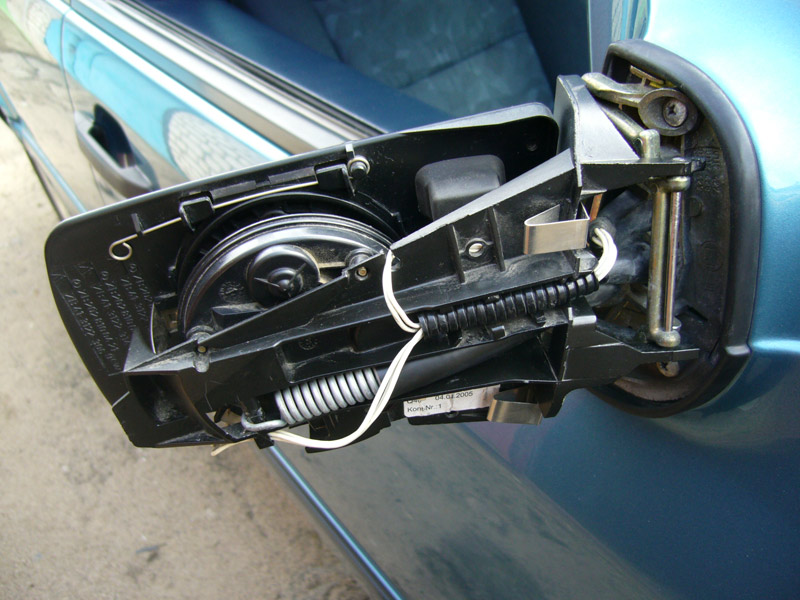 Отсоединив это хозяйство, а так же отключив разъем мы снимем зеркало. Снято Что бы снять стекляшку зеркала, необходимо снять фиксатор вверху, отсоединить клему подогрева и аккуратно расшатывая снять стекляшку с защелок в круге которых он держится. Вот хозяйство в разобранном состоянии, на фото видно поломанные части, а так же мыльница от донора. Перекинув стекляшки и провода, собираем в обратном порядке.