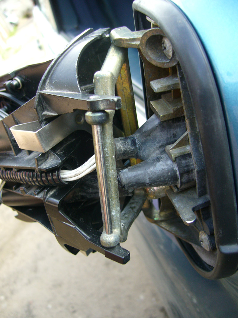 Опускаем стекло, становимся лицом к стекляшке зеркала и отгибаем целиком - видим защелку. Защелку сдвигаем на себя плоской отверткой. Может не сразу получиться, главное не торопиться. Освободившись усы дадут возможность стянуть мыльницу или корпус зеркала стянуть в сторону Получаем голый механизм Усы и направляющие, которые и ломаются. Зеркало к двери крепится 3-мя болтами под крест отвертку и пружиной.