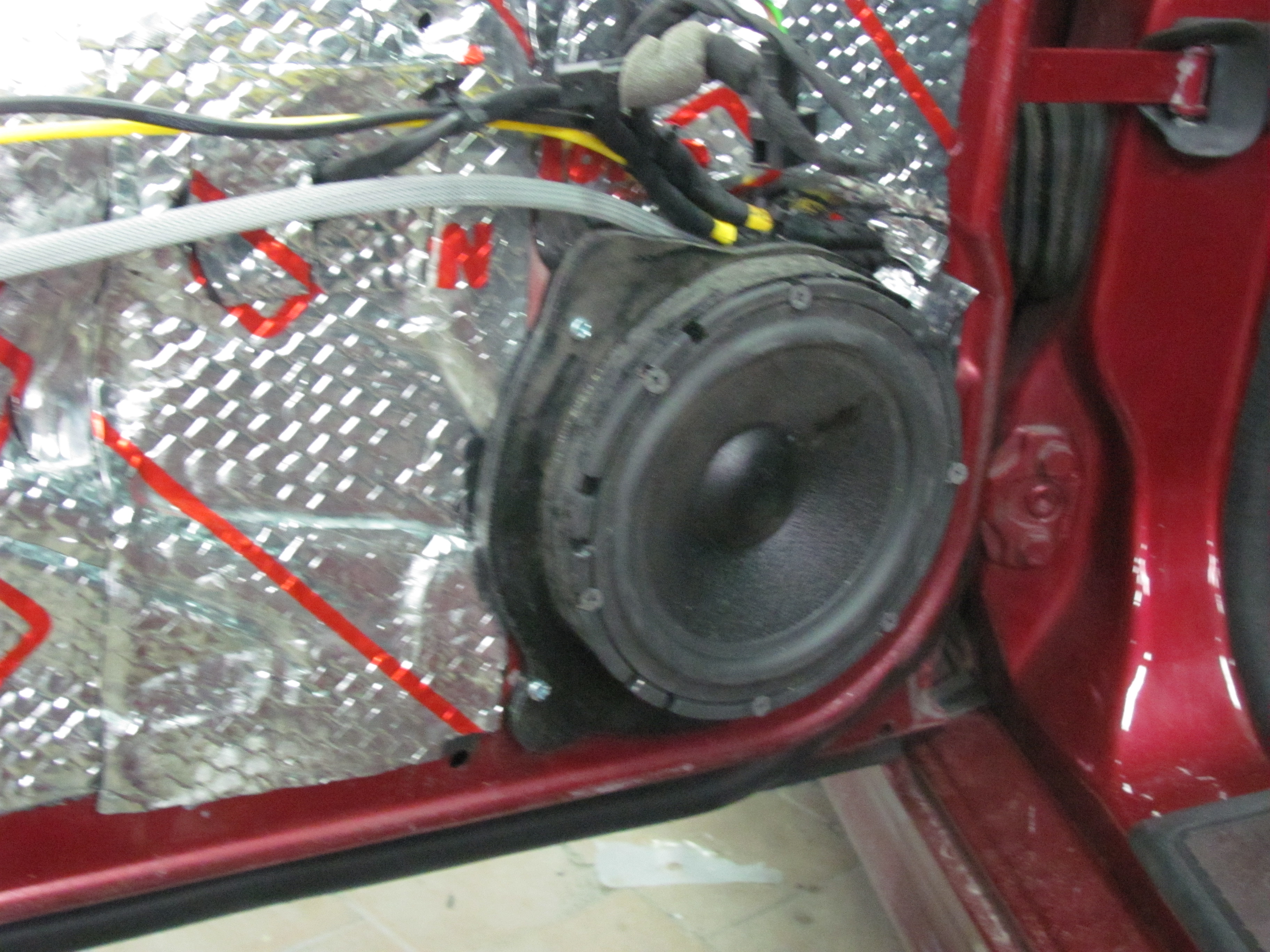Уже имелись миды Kicx Pro, поэтому было необходимо добавить кроссоверы и твитера, сделать полную аудиоподготовку двери, установить мидбасы в доработанные штатные места. Дверь укатана вибродемпфирующими материалами Noico, шумоизоляция наружного и внутреннего слоев металла, технологические отверстия усиливались металлическими ребрами жесткости. Усилитель Focal Solid 2 разместился за спинкой пассажира, провода Stinger и Tchernovaudio.