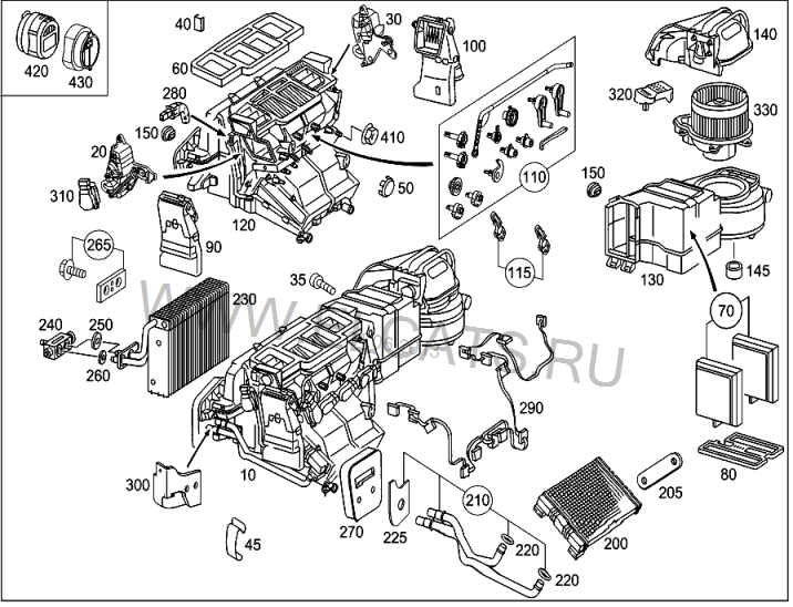 в моем 203.045 под ногами, если верить картинке (поз.70 - угольный салонный фильтр, стоит в коробе поз.130):