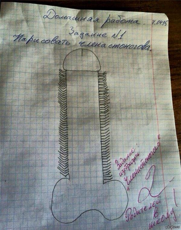 Диктант в школе. Учительница диктует: — Крокодил вылез из воды и лег на гальку...