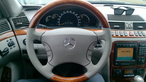 После такой работы ставить опять кож.зам даже не было мысли. И начались поиски людей, кто может пошить кожу на дерево в цвет салона. Сказать что я устал в поисках, это ничего не сказать. За это время я знаю всех, да именно всех, кто шьет рули / салоны для автомобилей в городе Минске и его пригороде. 80% всех портных работаю с одним видом кожи, я даже когда приезжал на подбор, беря в руки тестовые куски кожи, знал что моего цвета нет, хотя по телефону, приезжайте у нас есть все, а потом: "да не найдете вы такого цвета"! Было пару человек, кто понимал, что я хочу и сразу говорили нет. Через 10 дней безрезультатных поисков начал поднимать на уши всех знакомых, кто знает «подпольных» работников по пошиву рулей, одного даже вечером из бани вытащил, что бы он показал свои образцы. Долго подбирали… ничего! Мужик видя, что ему попался сильно замороченный клиент, сказал: «Есть один человек, работает под заказ с оригинальной кожей для мерседеса, могу дать его телефон, но гарантии нет» Уже через пол часа я был на другом конце города у этого человека. Вышел дядька, глянул на салон, ушел на 15 минут, вернулся с двумя видами и о чудо, один из них именно он, родной! Руль тот час же был отдан ему. Дядька сказал сделает только на следующий день, вечером. Ожидание проходило волнительно… На след вечер я ехал, точнее летел ну ооочень «низенько» за своим рулем. Да не зря я так долго искал то, что я хотел. Он получился такой как я себе его и представлял.