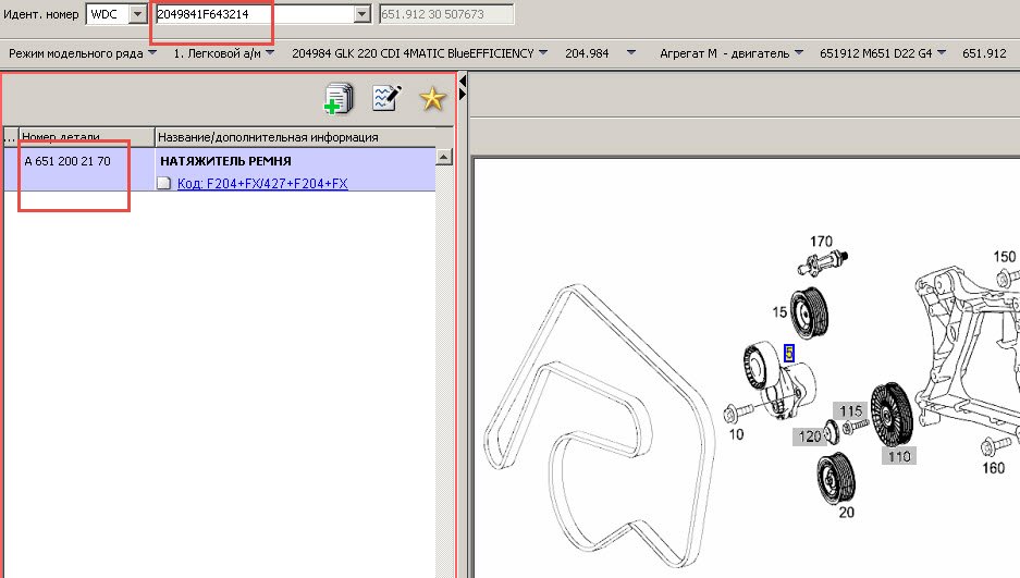 2) Натяжитель ремня по тому же ВИНу однозначно указан как A6512002170. Предыдущий хозяин (есть все бумаги, что менялось от момента продажи авто у дилера до мая 2019 года ) ставил A6512001770, в теме по подбору запчастей на benzclub по коду машины (204984, полного вина не было) кто-то спрашивал - тоже ответили A6512001770