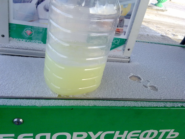 Поехал на работу и решил заехать на Гурского тож на зеленую, там без проблем влил отличной зимней прозрачной, для успокоения души и общественности влил 2л керосина на 18л ДТ, абы вебаста пыхтела.