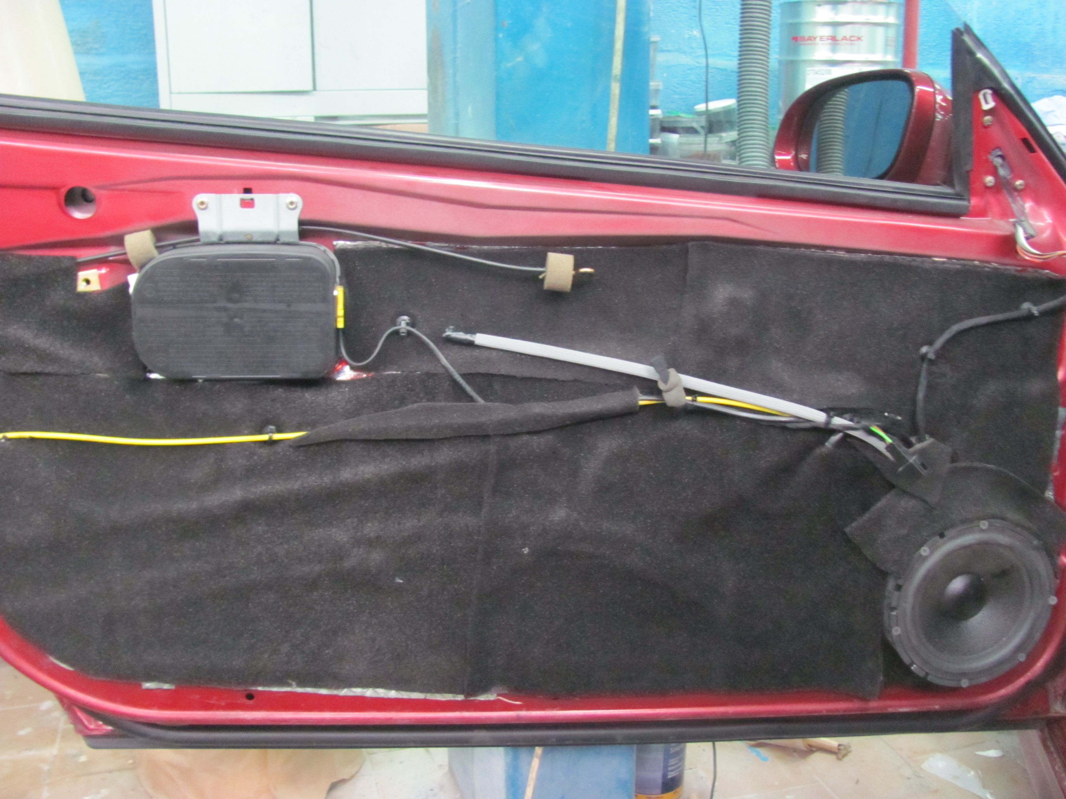 Уже имелись миды Kicx Pro, поэтому было необходимо добавить кроссоверы и твитера, сделать полную аудиоподготовку двери, установить мидбасы в доработанные штатные места. Дверь укатана вибродемпфирующими материалами Noico, шумоизоляция наружного и внутреннего слоев металла, технологические отверстия усиливались металлическими ребрами жесткости. Усилитель Focal Solid 2 разместился за спинкой пассажира, провода Stinger и Tchernovaudio.