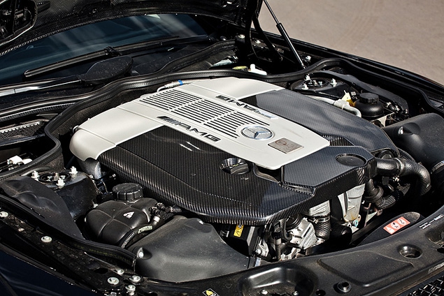 И могучая лавина момента, искусственно ограниченная на уровне 1000 Нм, - для того, чтобы при каждом старте не перемалывать в железную крошку шестеренки коробки передач и заднего редуктора. Потому что на самом деле этот мотор способен выдать невероятные 1200 Ньютон-метров! О, этот знаменитый мотор! Шесть литров, три клапана на цилиндр – мы помним его по легендарному «шестисотому». Сейчас в варианте с двумя турбинами он присутствует и на «обычном» SL 65 AMG, где выдает «всего» 612 сил. Однако перед установкой на Black Series его снабдили другими турбонагнетателями, изменили впуск, заново настроили выпуск и перепрошили «мозги». Результат – 670‑сильный, совершенно бескомпромиссный «зверь», живущий под длинным карбоновым капотом. Из углепластика изготовлено еще много деталей кузова: крышка багажника, активный задний спойлер, передний бампер, диффузор и… стационарная крыша. Да, в отличие от серийного родстера SL, у Black Series нет складывающейся крыши – ее вырвали со всеми потрохами, заменив на сверхлегкий карбоновый аналог. В итоге, Black Series получился на 250 килограммов (!) легче гражданского SL 65.