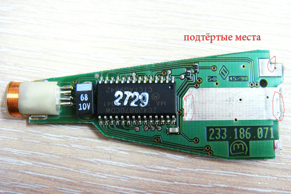 Стал подглючивать мой ключ - как будто умирает: замок зажигания его не видит не реагирует при вставлении, в тот же момент не моргает светодиод при нажатии, пошевелишь немного батарейный отсек ключа - вроде как заработает как ни в чём не бывало. Периодичность глюка не предсказуема - может за день несколько раз случиться, а может быть и всё нормально. Плату просматривал в увеличилку 12ти кратную (максимум что у меня нашлось ) трещин и отвалившихся элементов не видно (был бы МБС может и увидел бы что ещё - но у меня его нет) единственное что смутило - так это подтёртые места в месте контакта лепестков от кассеты питания.